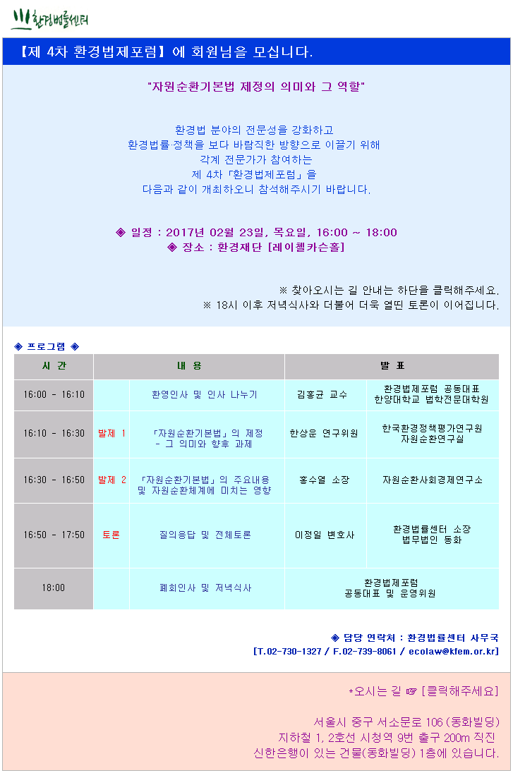 센터 소식 [제 4차 환경법제포럼_2017.02.23(목)] "자원순환기본법 제정의 의미와 그 역할" 작성자 환경법률센터 작성일 2017-02-09 10:42 조회 1046 페이스북 트위터 구글+ 좋아요 0 싫어요 0 인쇄 4차포럼_자료집_최종편집본.pdf 전체 0 추천순 작성순 최신순 작성자 비밀번호 « [정책토론회] "전기안전법 논란, 끝장토론" - 손금주 국회의원실 사무실 공사 안내 » 목록보기 답글쓰기 글수정 글삭제 Powered by KBoard